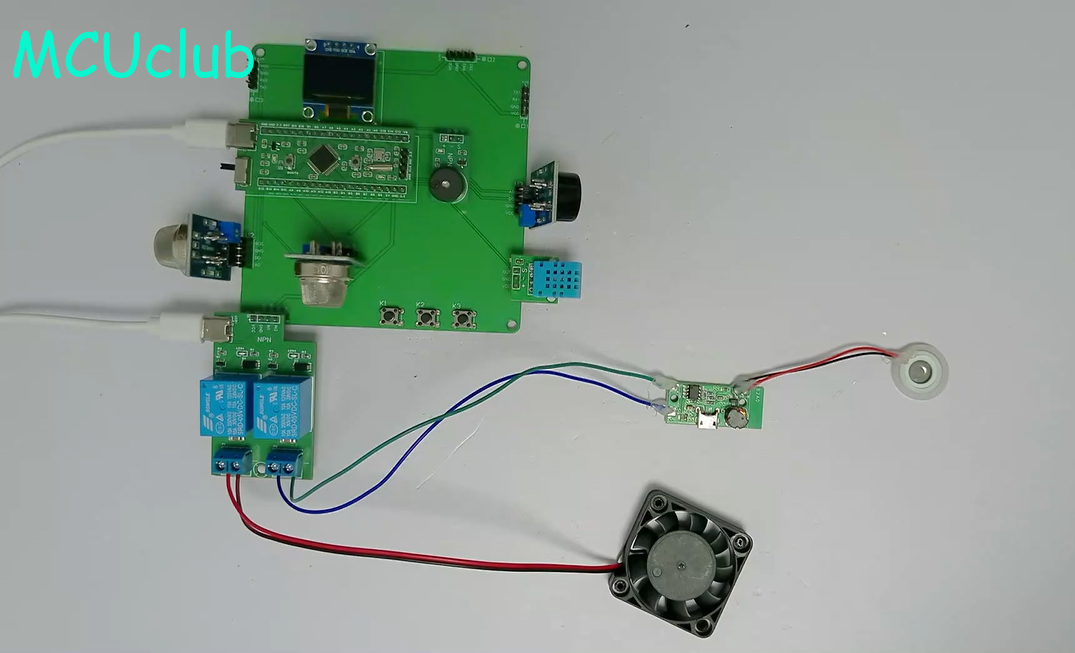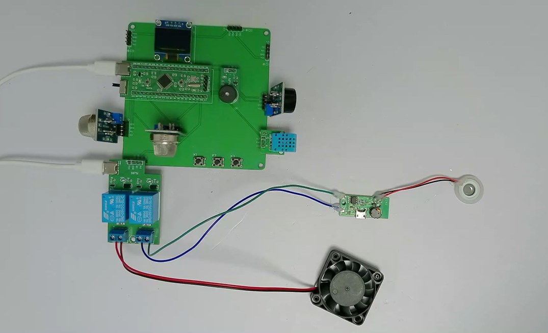 2、通过MQ-2模块检测烟雾值,当烟雾值大于设置最大值时开启风扇和净化器,同时进行声光报警提醒