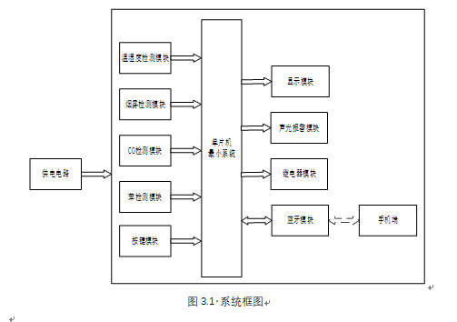 扩展功能:通过蓝牙模块将测量数据发送到手机端,手机端可设置温湿度上下限值、烟雾、CO及苯气体最大值,另外,当烟雾值、CO值及苯气体值小于等于设置最大值时,可远程控制风扇或净化器开关
