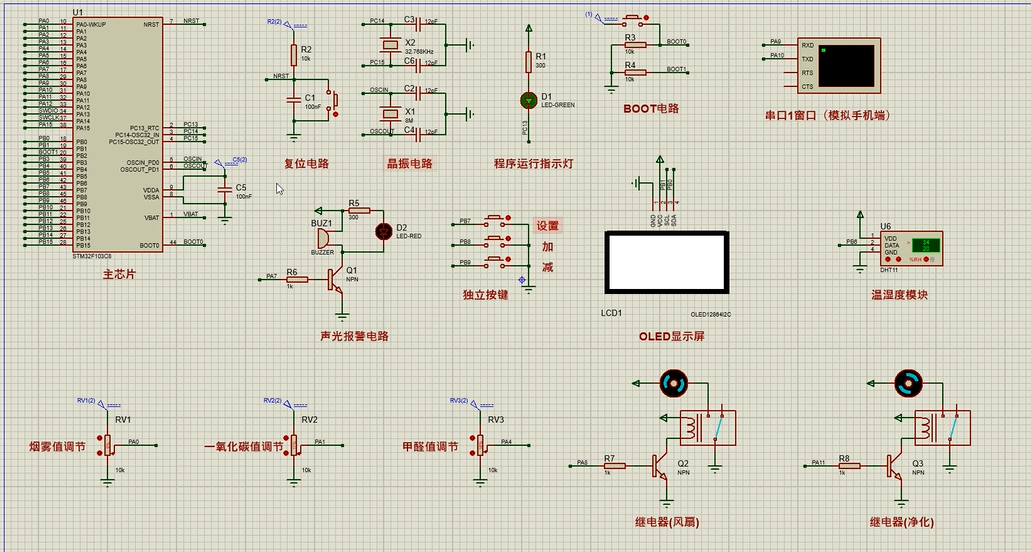 4、通过MS1100模块检测甲醛值,当苯气体值大于设置最大值时开启风扇和净化器,同时进行声光报警提醒