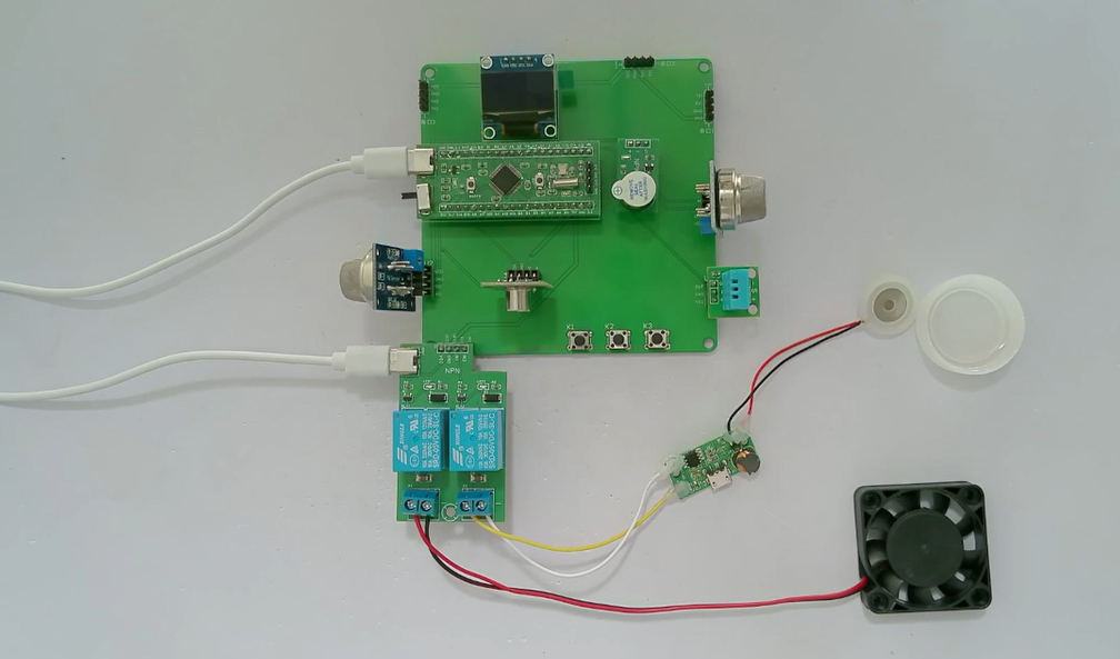 2、通过MQ-2模块检测烟雾值,当烟雾值大于设置最大值时开启风扇和净化器,同时进行声光报警提醒