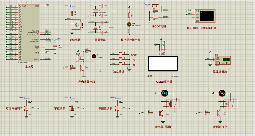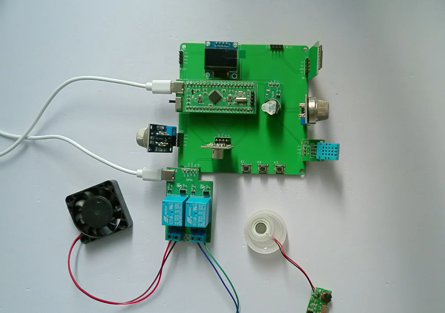 4、通过MS1100模块检测甲醛值,当甲醛值大于设置最大值时开启风扇和净化器,同时进行声光报警提醒
