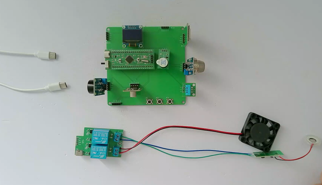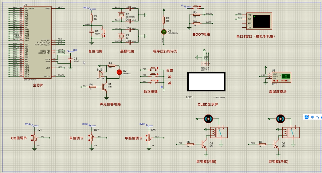 4、通过MS1100模块检测甲醛值,当甲醛值大于设置最大值时开启风扇和净化器,同时进行声光报警提醒