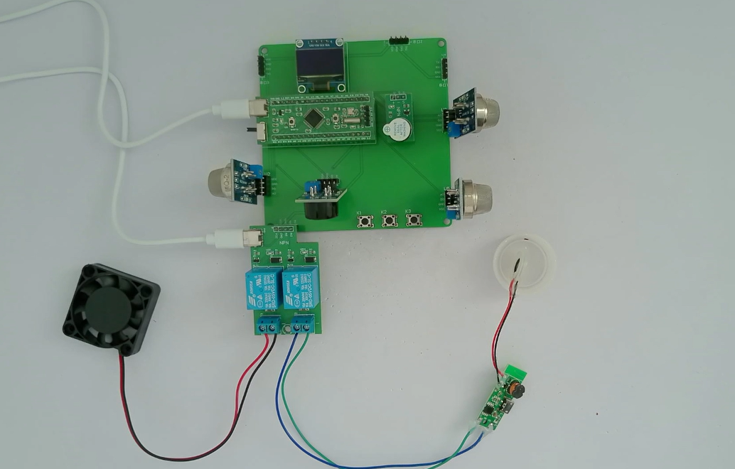 1、通过MQ-2模块检测烟雾值,当烟雾值大于设置最大值时开启风扇和净化器,同时进行声光报警提醒