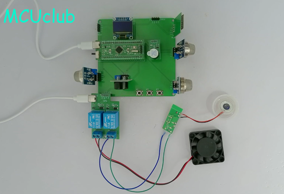 1、通过MQ-2模块检测烟雾值,当烟雾值大于设置最大值时开启风扇和净化器,同时进行声光报警提醒