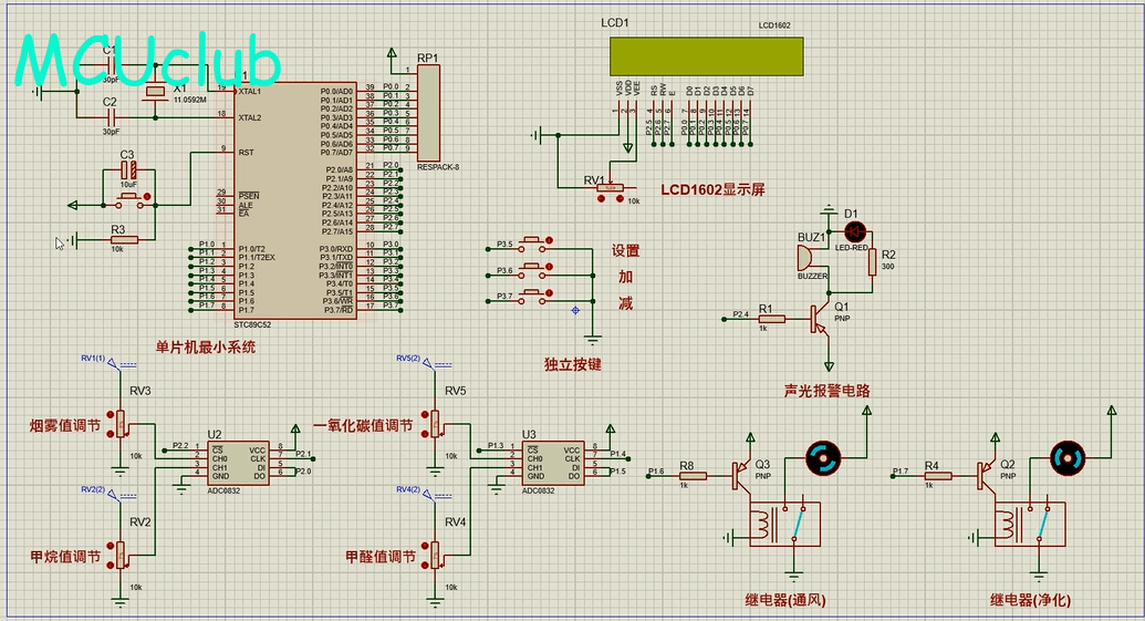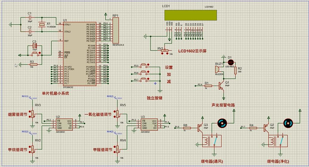 4、通过MS1100模块检测甲醛值,当甲醛值大于设置最大值时开启风扇和净化器,同时进行声光报警提醒