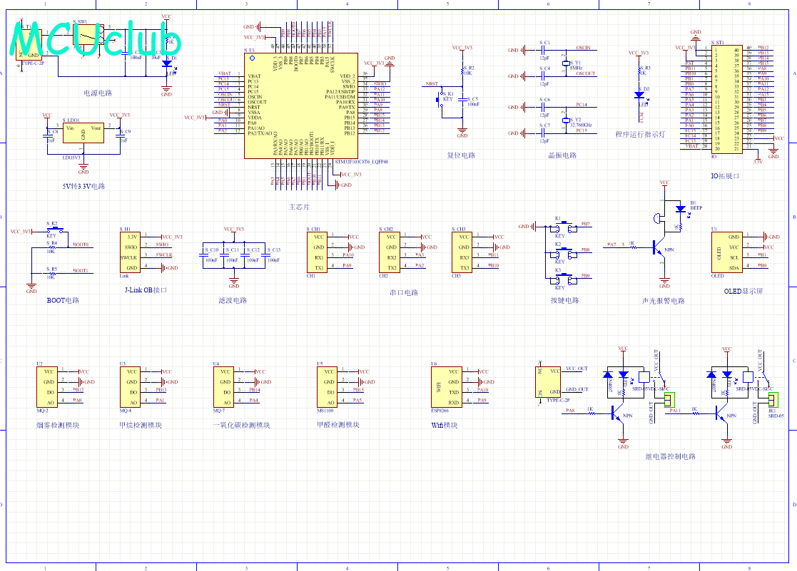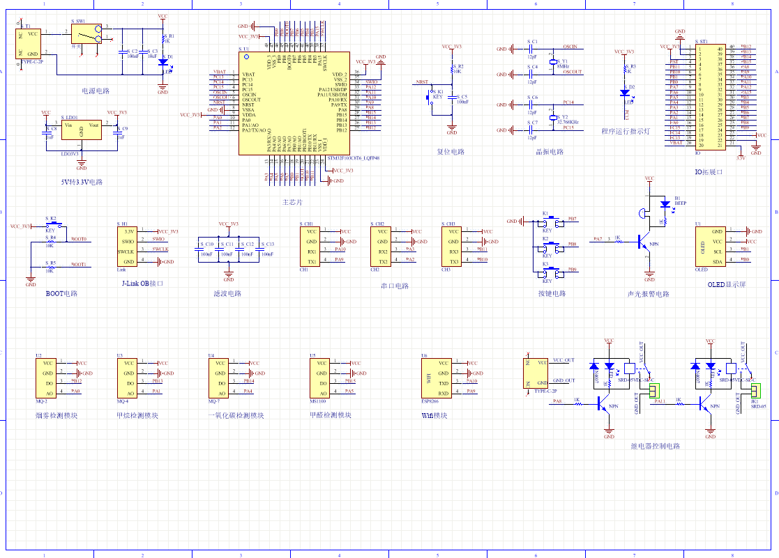 PCB图是由原理图导出,封装很大一部分都是作者自己绘制,不提供封装库,只提供连接好的源文件,可以直接在嘉立创进行打板。两层板,上下覆铜接地。