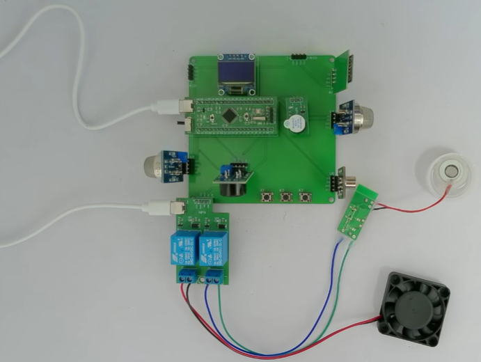 1、通过MQ-2模块检测烟雾值,当烟雾值大于设置最大值时开启风扇和净化器,同时进行声光报警提醒
