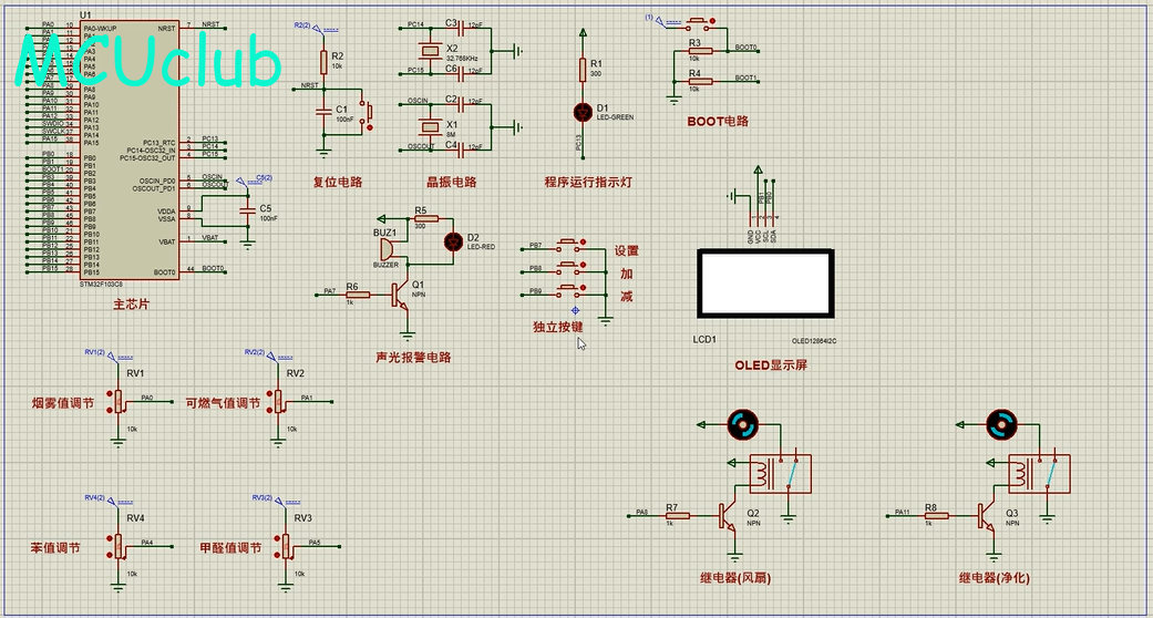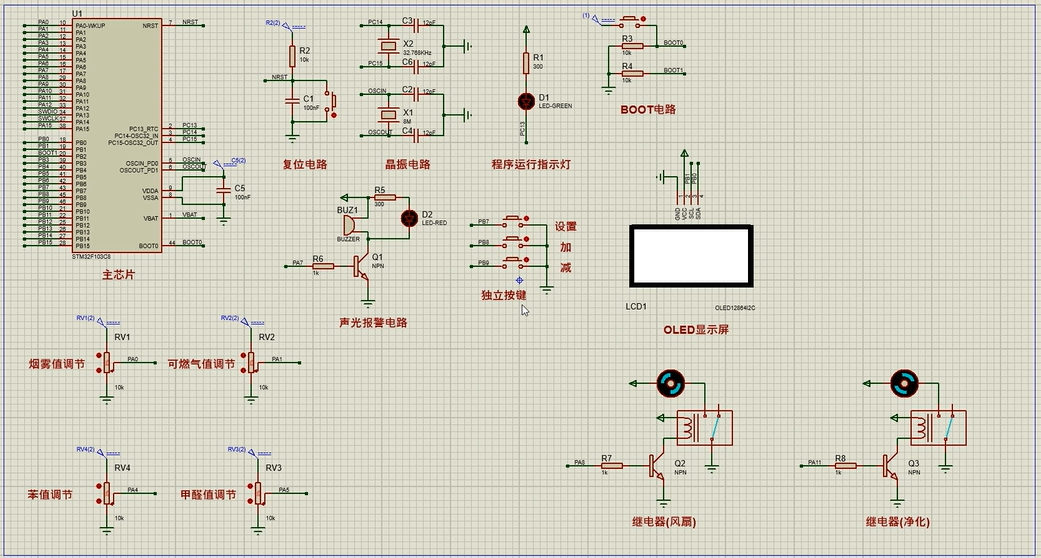 5、通过按键设置烟雾、可燃气体、苯气体及甲醛最大值,另外,当烟雾值、可燃气体值、苯气体值及甲醛值小于等于设置最大值时,可手动控制风扇或净化器开关