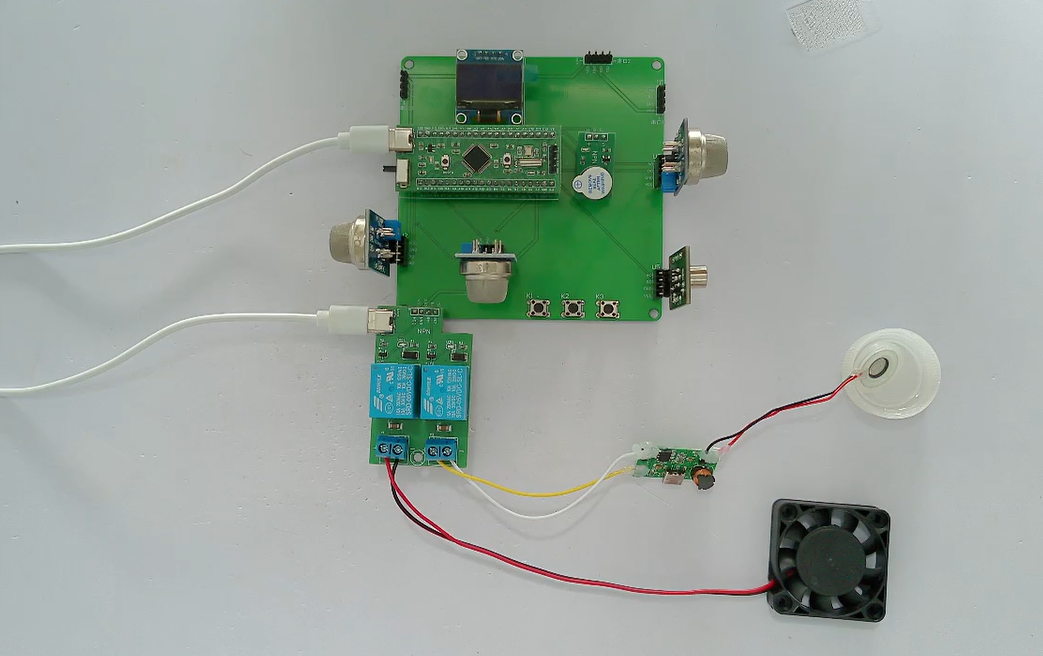 1、通过MQ-2模块检测烟雾值,当烟雾值大于设置最大值时开启风扇和净化器,同时进行声光报警提醒