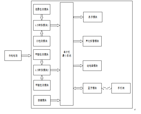 5、通过按键设置烟雾、CO、苯气体及甲醛最大值,另外,当烟雾值、CO、苯气体值及甲醛值小于等于设置最大值时,可手动控制风扇或净化器开关