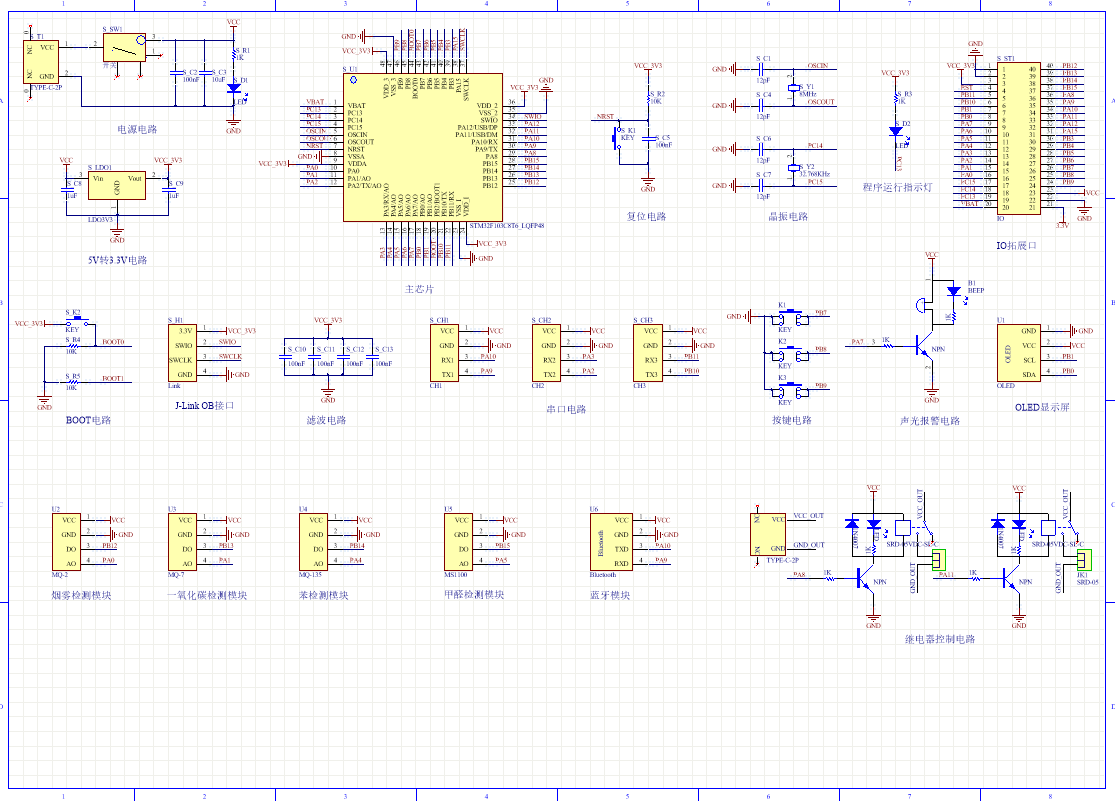 PCB图是由原理图导出,封装很大一部分都是作者自己绘制,不提供封装库,只提供连接好的源文件,可以直接在嘉立创进行打板。两层板,上下覆铜接地。