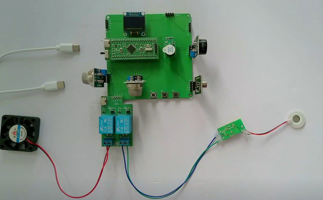 3、通过MQ-135模块检测苯气体值,当苯气体值大于设置最大值时开启风扇和净化器,同时进行声光报警提醒