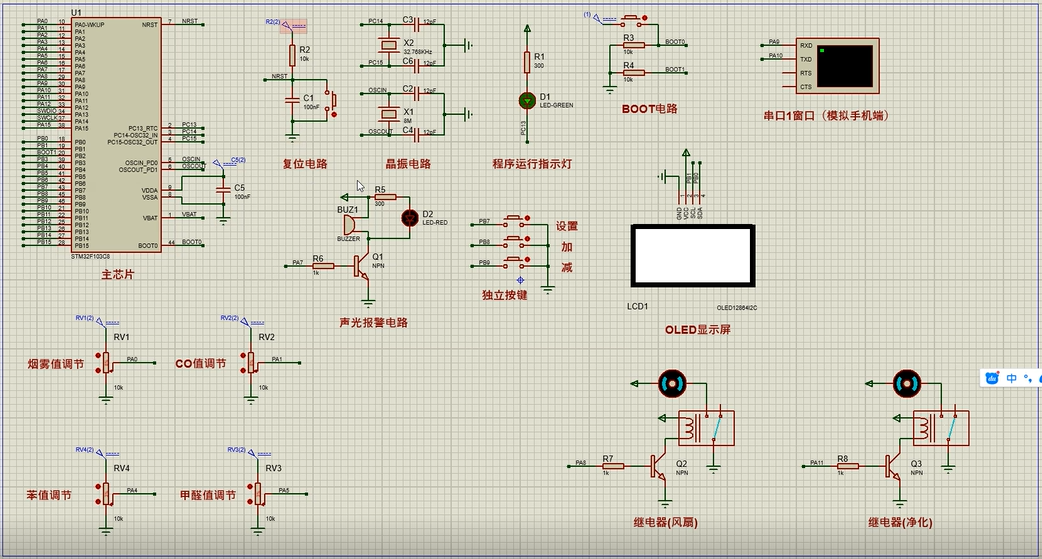 2、通过MQ-7模块检测CO值,当CO值大于设置最大值时开启风扇和净化器,同时进行声光报警提醒