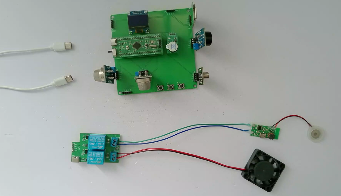 1、通过MQ-2模块检测烟雾值,当烟雾值大于设置最大值时开启风扇和净化器,同时进行声光报警提醒