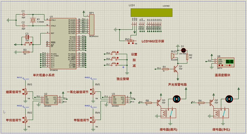 5、通过MS1100模块检测甲醛值,当甲醛值大于设置最大值时开启风扇和净化器,同时进行声光报警提醒