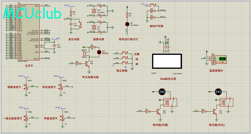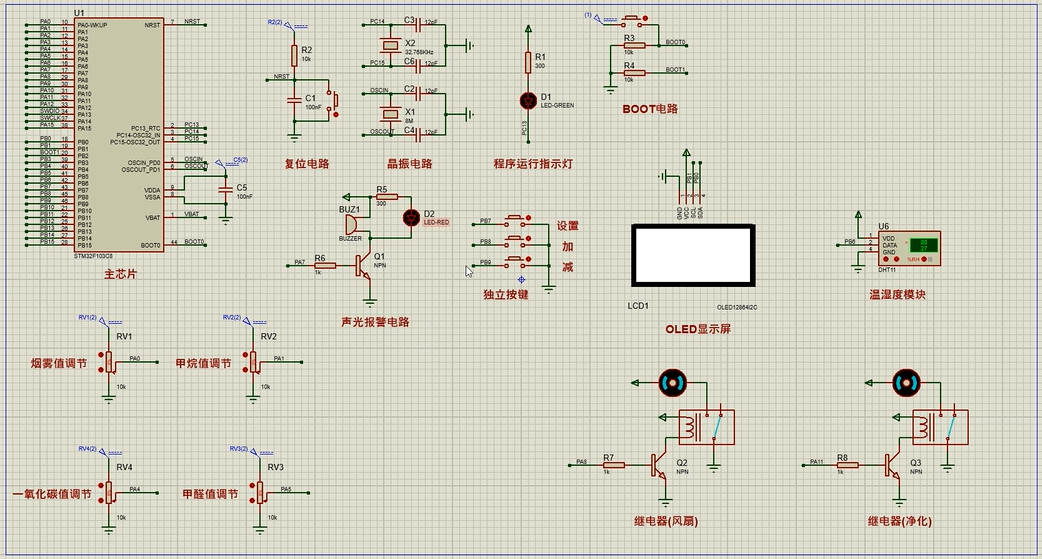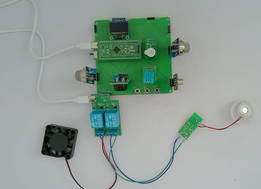 5、通过MS1100模块检测甲醛值,当甲醛值大于设置最大值时开启风扇和净化器,同时进行声光报警提醒