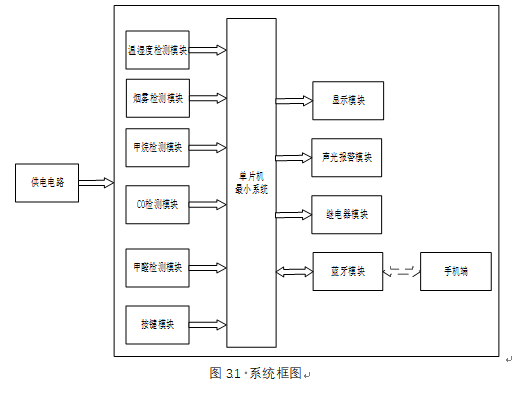 扩展功能:通过蓝牙模块将测量数据发送到手机端,手机端可设置温湿度上下限值、烟雾、甲烷、CO及甲醛最大值,另外,当烟雾值、甲烷值、CO值及甲醛值小于等于设置最大值时,可远程控制风扇或净化器开关