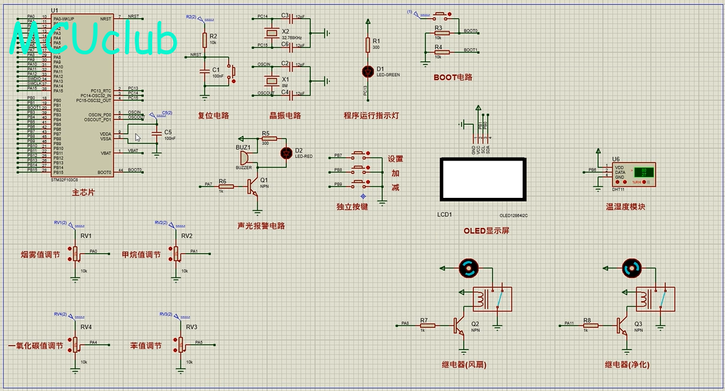 5、通过MQ-135模块检测苯气体值,当苯气体值大于设置最大值时开启风扇和净化器,同时进行声光报警提醒