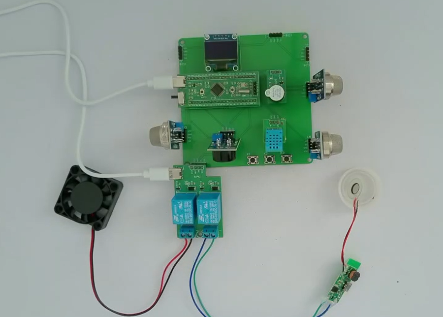 2、通过MQ-2模块检测烟雾值,当烟雾值大于设置最大值时开启风扇和净化器,同时进行声光报警提醒