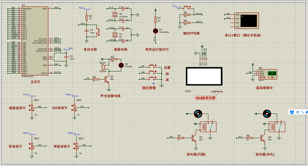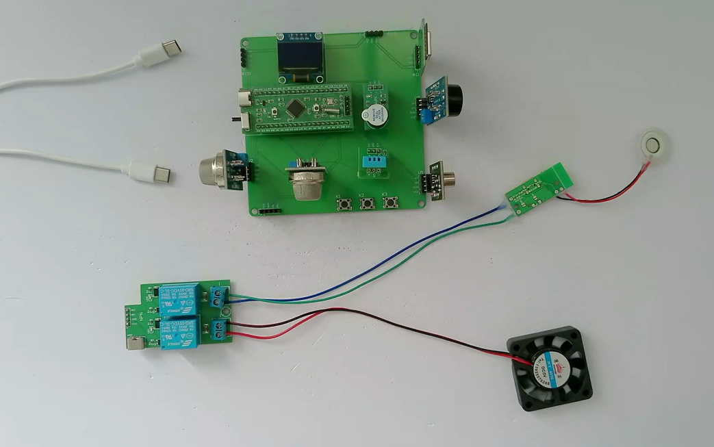 5、通过MS1100模块检测甲醛值,当甲醛值大于设置最大值时开启风扇和净化器,同时进行声光报警提醒