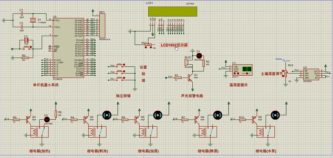 3、通过按键设置环境温湿度上下限值、土壤湿度上下限值,另外,当环境温度值在上下限值之间时,可手动控制加热、制冷开关;当环境湿度值在上下限值之间时,可手动控制加湿、除湿开关;当土壤湿度值在上下限值之间时,可手动控制水泵开关