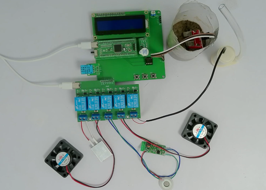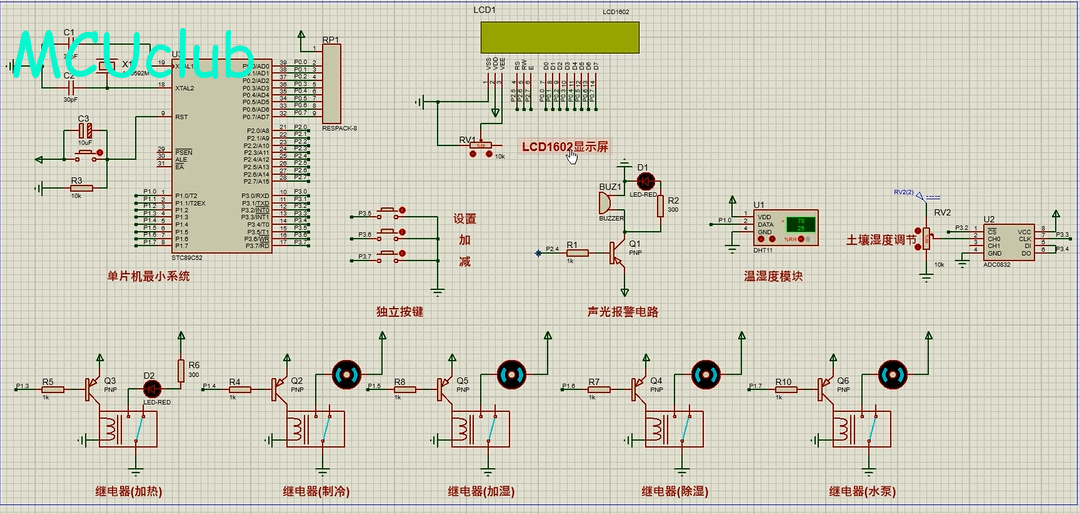 1、通过DHT11检测大棚内环境温湿度值,当温湿度值不在设置的范围内,进行相应的加热、制冷、加湿、除湿处理,并声光报警提醒