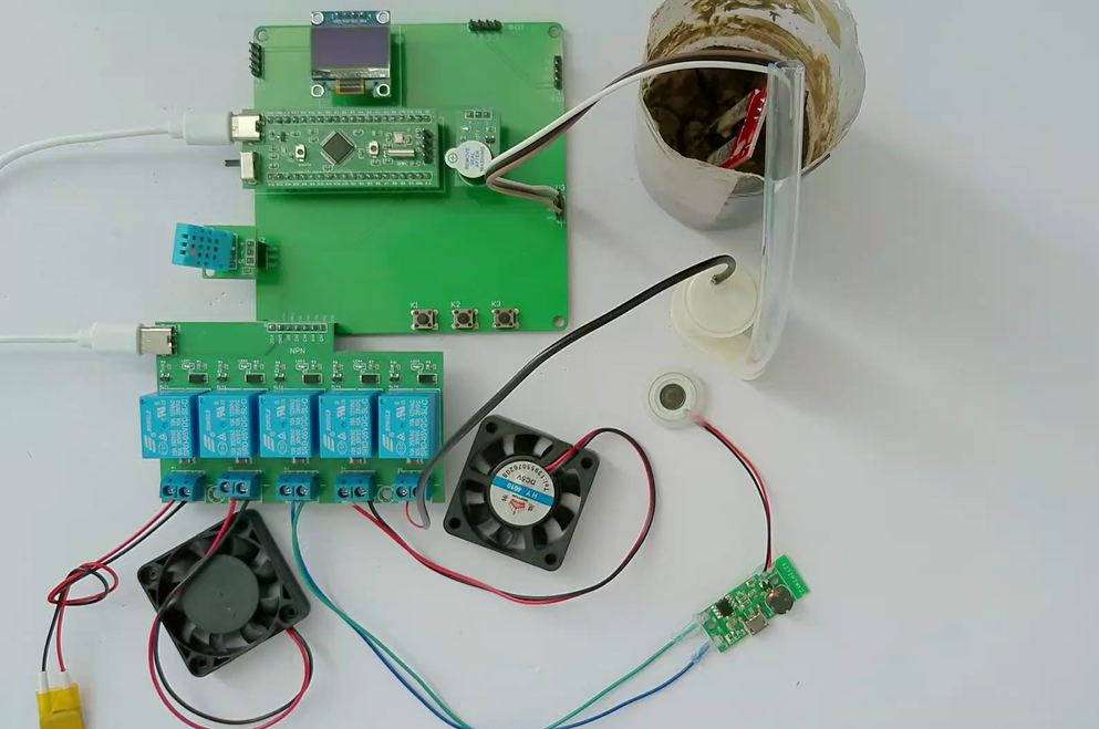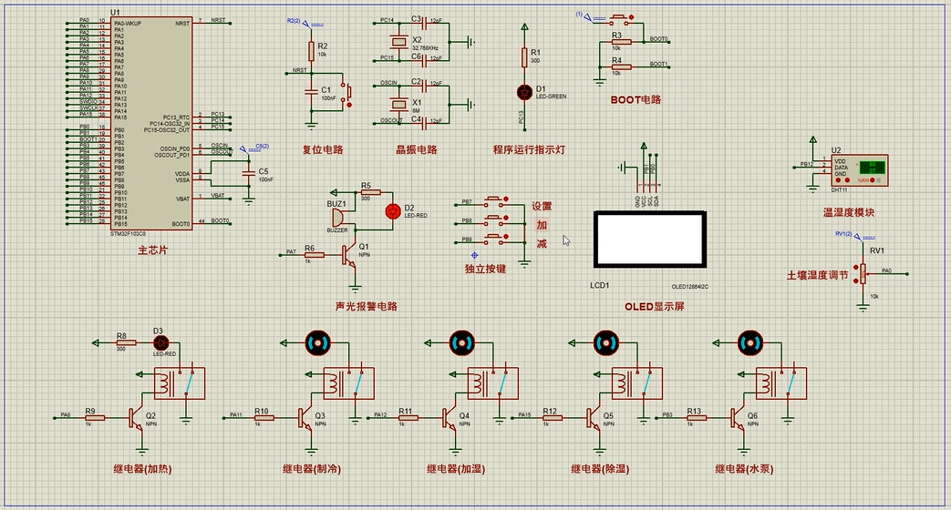 扩展功能:通过蓝牙模块将测量数据发送到手机端,手机端可设置环境温湿度上下限值、土壤湿度上下限值,另外,当环境温度值在上下限值之间时,可远程控制加热、制冷开关;当环境湿度值在上下限值之间时,可远程控制加湿、除湿开关;当土壤湿度值在上下限值之间时,可远程控制水泵开关