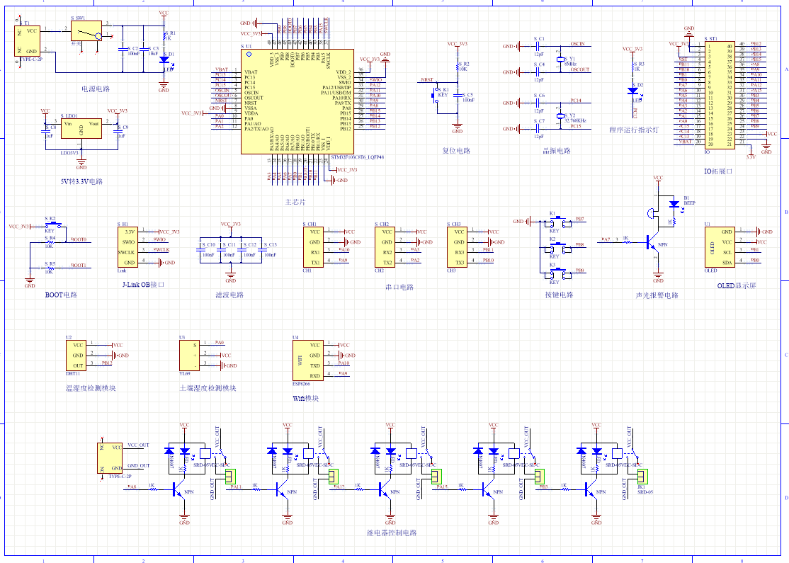 PCB图是由原理图导出,封装很大一部分都是作者自己绘制,不提供封装库,只提供连接好的源文件,可以直接在嘉立创进行打板。两层板,上下覆铜接地。