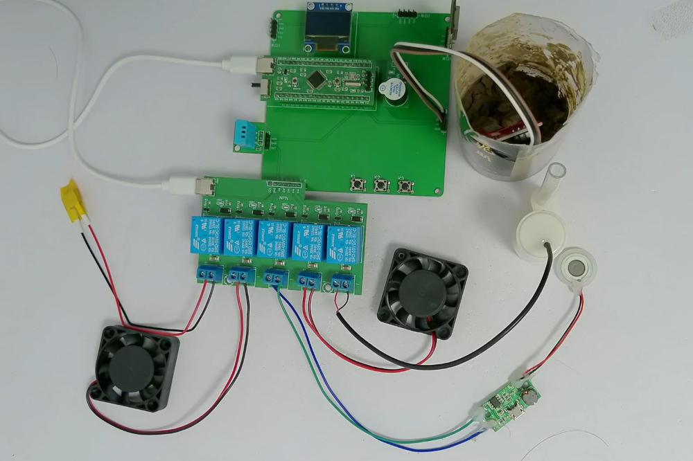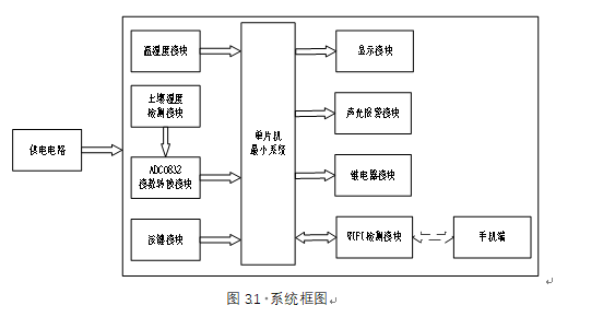 2、通过土壤湿度模块检测土壤湿度,当湿度值小于设置最小值,自动打开水泵浇水,直到湿度大于设置最大值,并声光报警提醒
