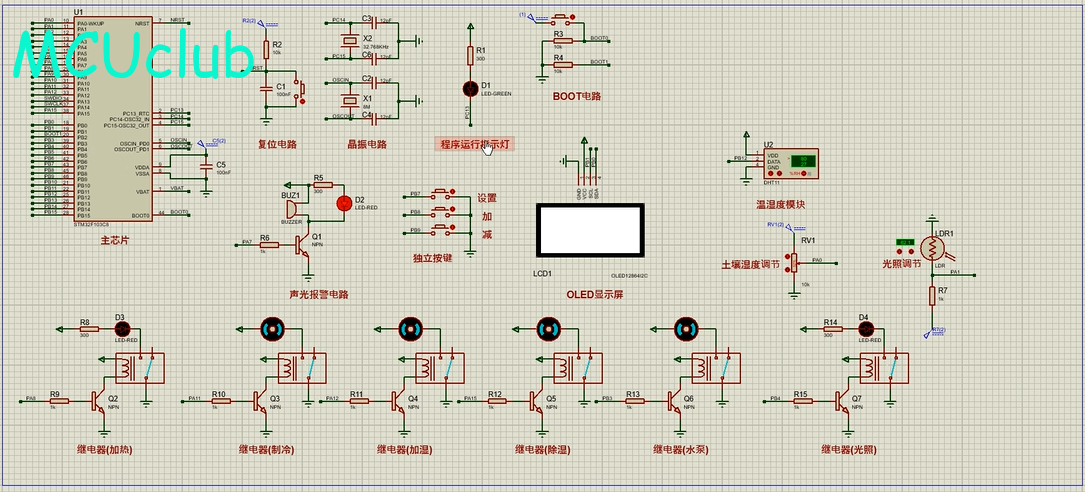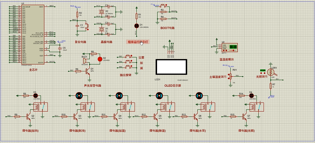 1、通过DHT11检测大棚内环境温湿度值,当温湿度值不在设置的范围内,进行相应的加热、制冷、加湿、除湿处理,并声光报警提醒