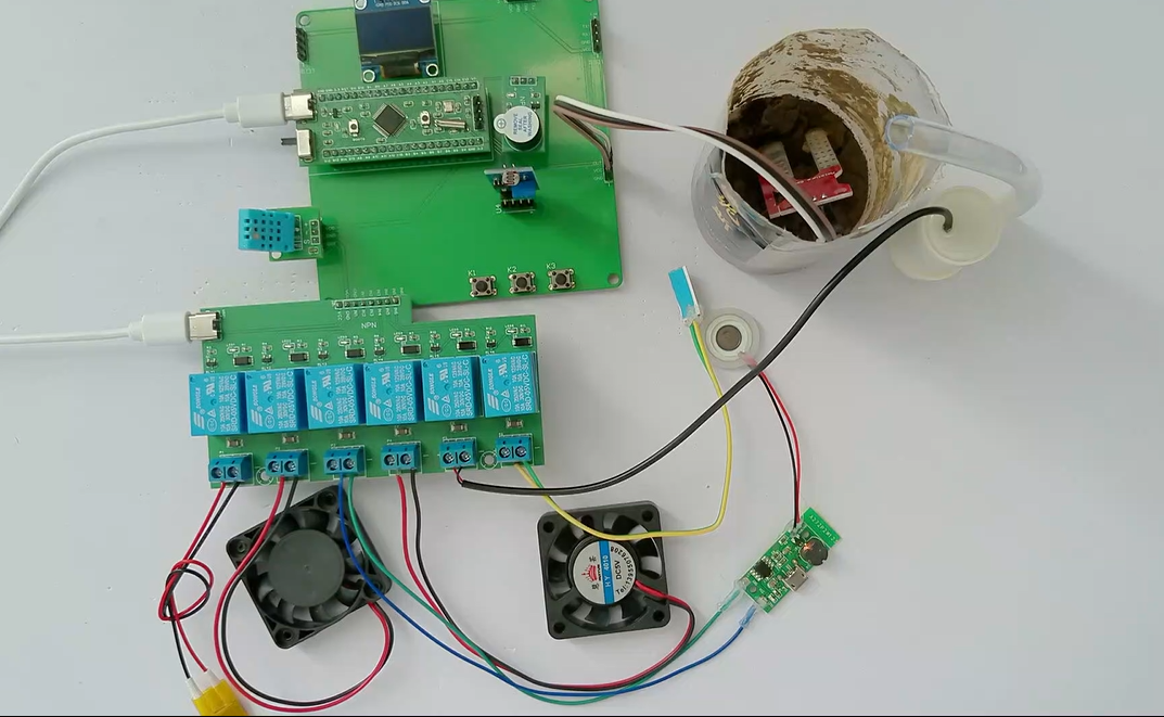 2、通过土壤湿度模块检测土壤湿度,当湿度值小于设置最小值,自动打开水泵浇水,直到湿度大于设置最大值,并声光报警提醒