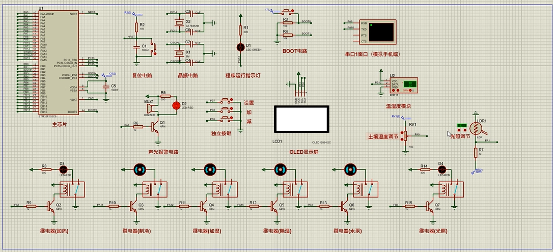 4、通过按键设置环境温湿度上下限值、土壤湿度上下限值、光照最小值,另外,当环境温度值在上下限值之间时,可手动控制加热、制冷开关;当环境湿度值在上下限值之间时,可手动控制加湿、除湿开关;当土壤湿度值在上下限值之间时,可手动控制水泵开关;当光照值大于等于设置的最小值时,可手动控制补光灯开关