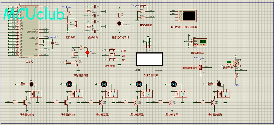 1、通过DHT11检测大棚内环境温湿度值,当温湿度值不在设置的范围内,进行相应的加热、制冷、加湿、除湿处理,并声光报警提醒