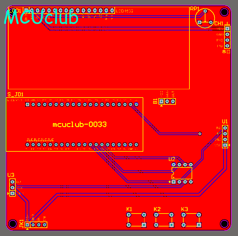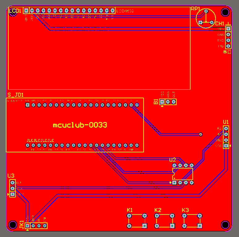 PCB图是由原理图导出,封装很大一部分都是作者自己绘制,不提供封装库,只提供连接好的源文件,可以直接在嘉立创进行打板。两层板,上下覆铜接地。