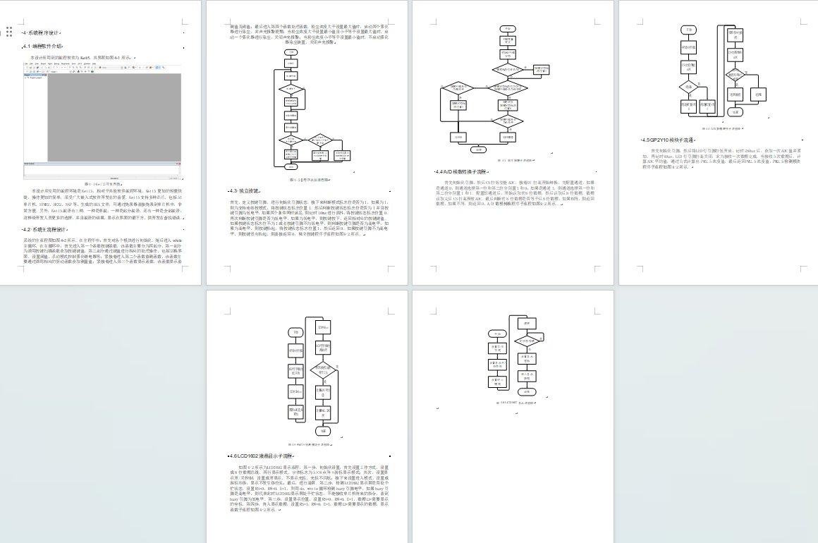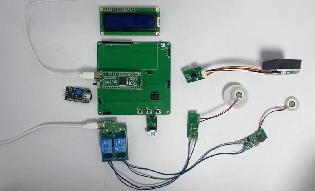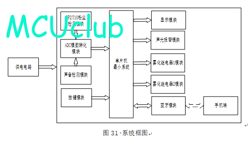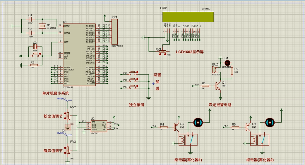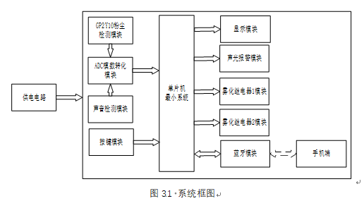 1、通过GP2Y10检测模块检测粉尘浓度,当粉尘浓度大于设置最大值时,启动两个雾化器进行除尘,并声光报警提醒;当粉尘浓度大于设置最小值且小于等于设置最大值时,启动一个雾化器进行除尘,关闭声光报警;当粉尘浓度小于等于设置最小值时,不启动雾化器除尘装置,关闭声光报警
