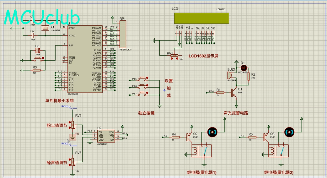 3、通过按键设置粉尘浓度上下限值、噪声最大值,另外,当粉尘浓度值小于等于设置最小值时,可手动控制雾化器开关