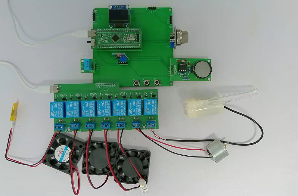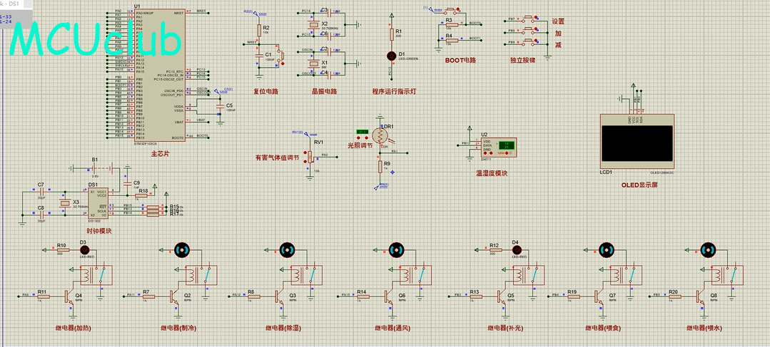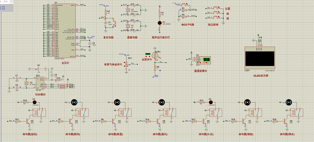1、通过DHT11检测温湿度值,当温度值大于设置最大值时,进行降温;当温度值小于设置最小值时,进行升温;当湿度值大于设置大最大值时,进行除湿