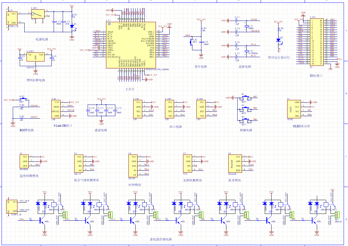PCB图是由原理图导出,封装很大一部分都是作者自己绘制,不提供封装库,只提供连接好的源文件,可以直接在嘉立创进行打板。两层板,上下覆铜接地。