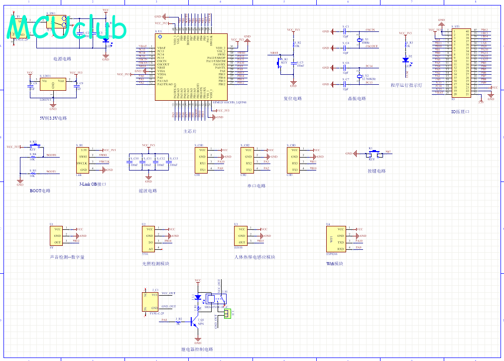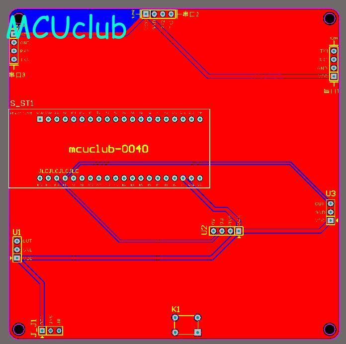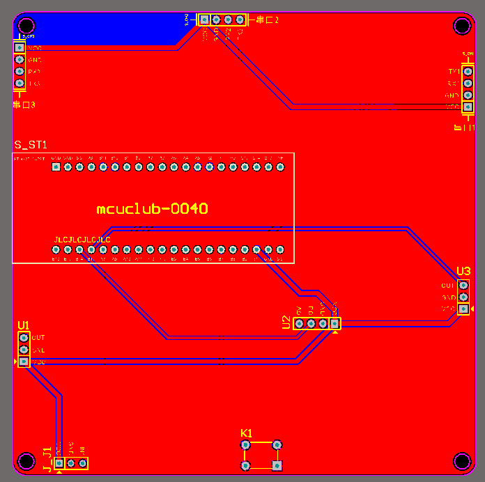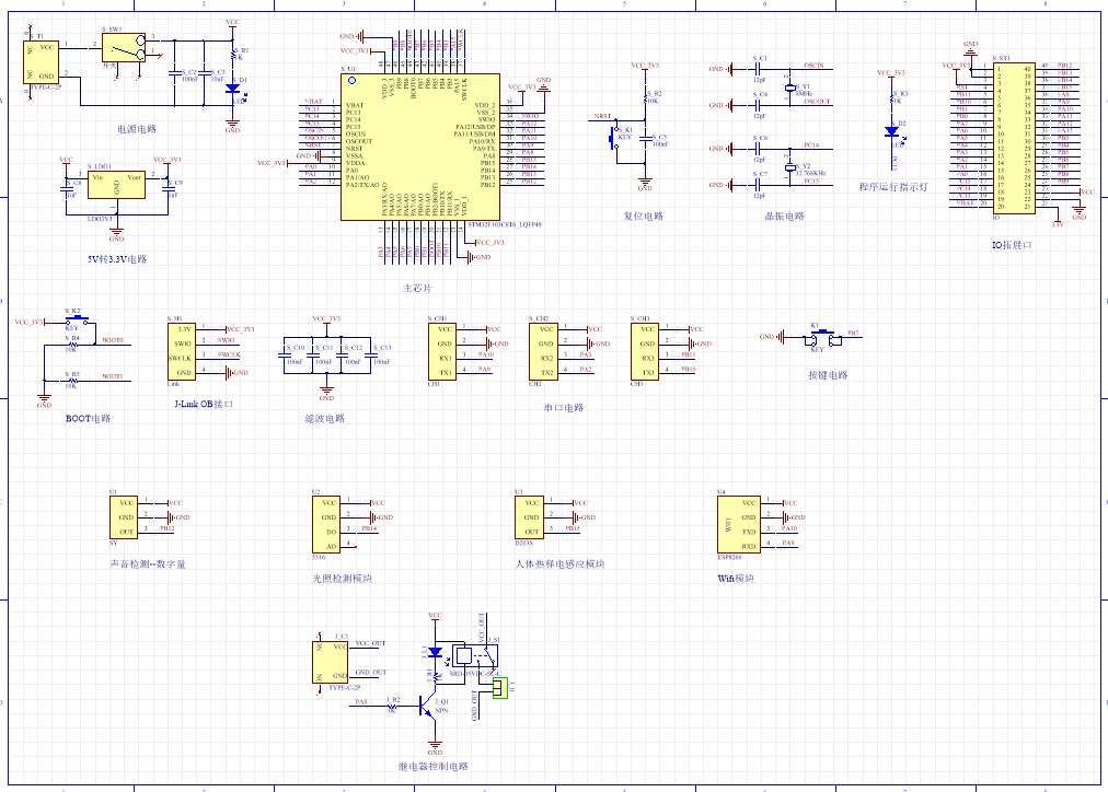 PCB图是由原理图导出,封装很大一部分都是作者自己绘制,不提供封装库,只提供连接好的源文件,可以直接在嘉立创进行打板。两层板,上下覆铜接地。