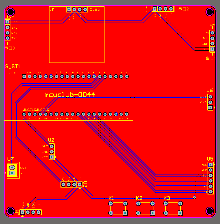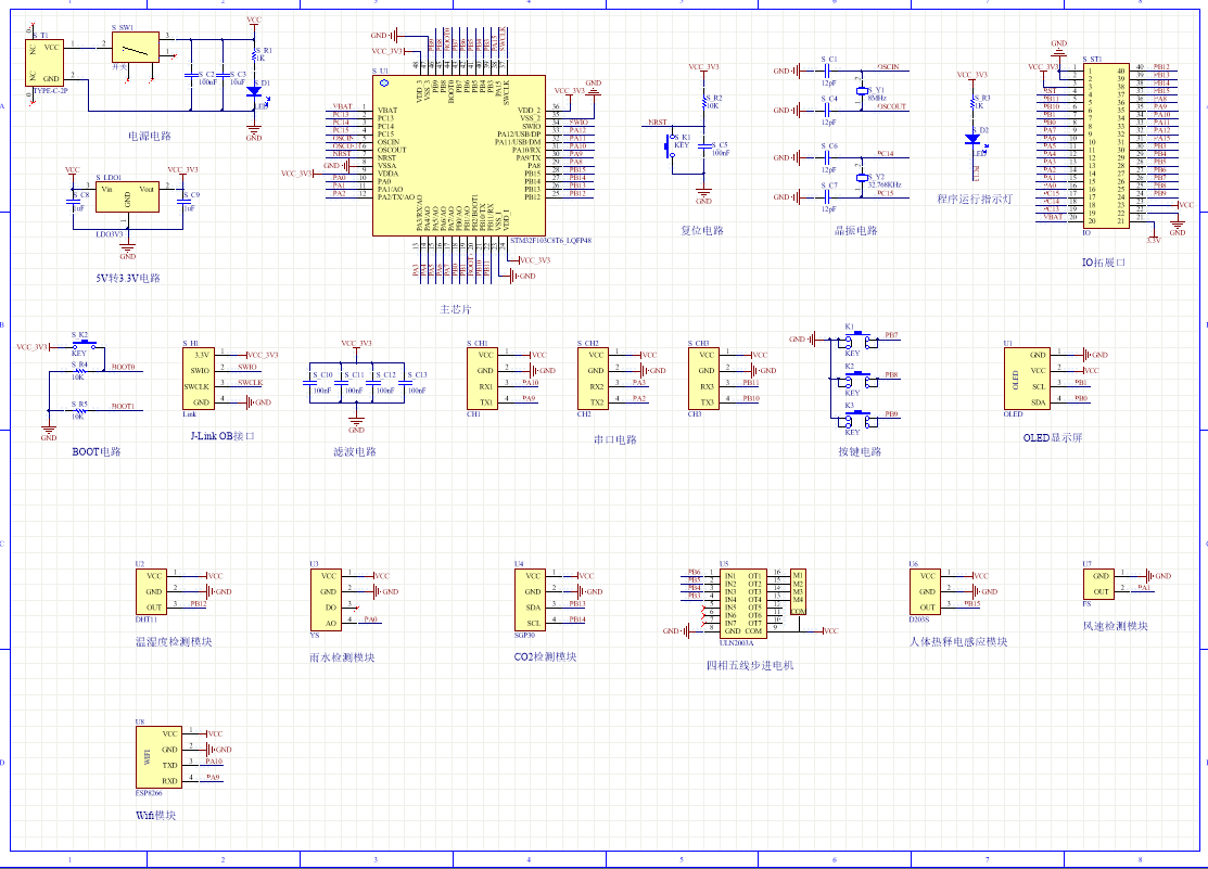 PCB图是由原理图导出,封装很大一部分都是作者自己绘制,不提供封装库,只提供连接好的源文件,可以直接在嘉立创进行打板。两层板,上下覆铜接地。