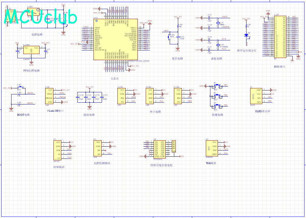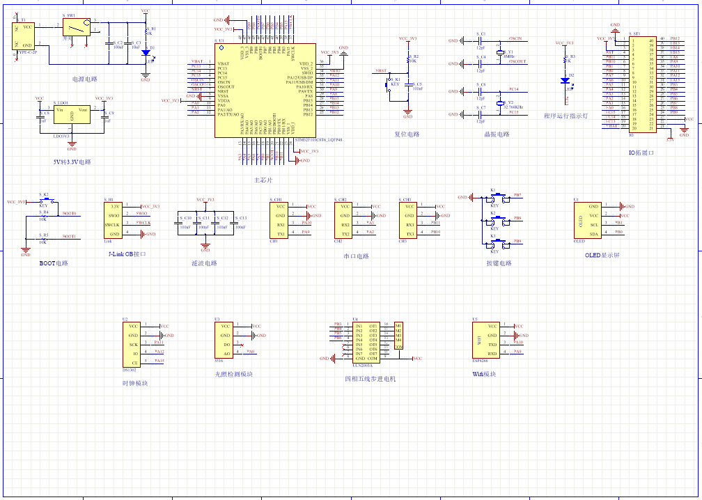 PCB图是由原理图导出,封装很大一部分都是作者自己绘制,不提供封装库,只提供连接好的源文件,可以直接在嘉立创进行打板。两层板,上下覆铜接地。