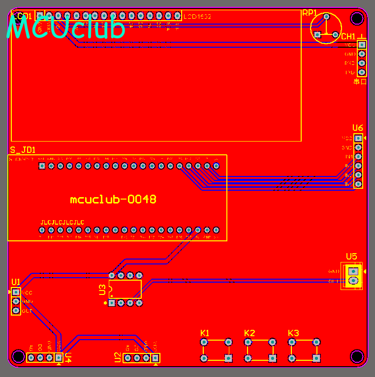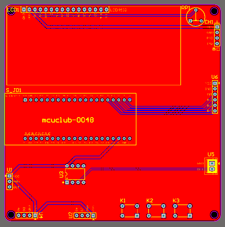 PCB图是由原理图导出,封装很大一部分都是作者自己绘制,不提供封装库,只提供连接好的源文件,可以直接在嘉立创进行打板。两层板,上下覆铜接地。