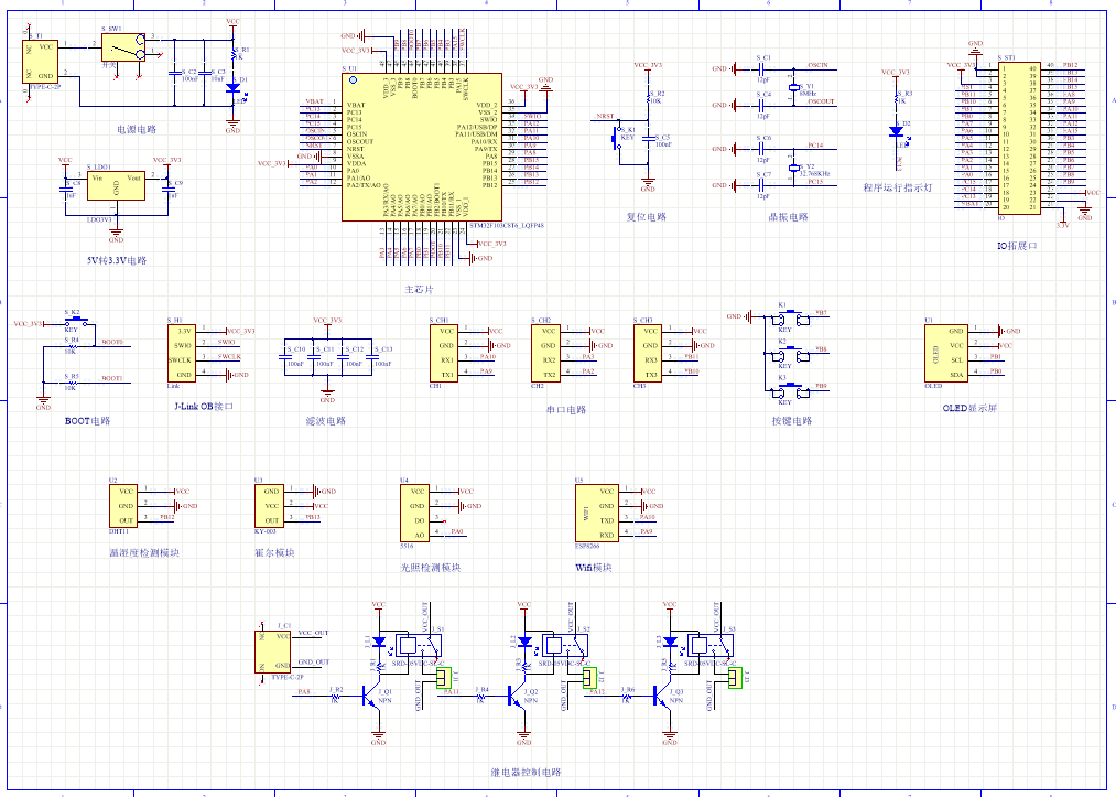 PCB图是由原理图导出,封装很大一部分都是作者自己绘制,不提供封装库,只提供连接好的源文件,可以直接在嘉立创进行打板。两层板,上下覆铜接地。