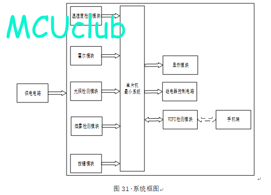 4、通过MQ-2检测烟雾值,当烟雾值大于设置最大值,启动水泵灭火,并声光报警提醒