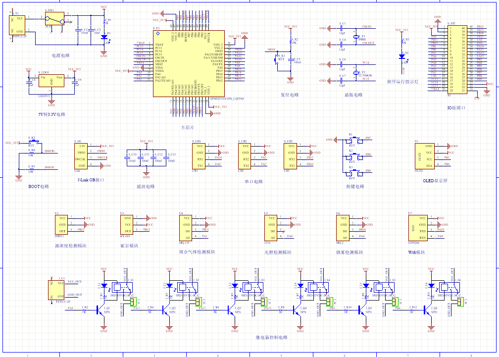 底板:底板在嘉立创进行打板,为绿色PCB板,两层板,厚度1.2,上下覆铜接地。元器件基本上为插针式,个别降压芯片会使用贴片式。