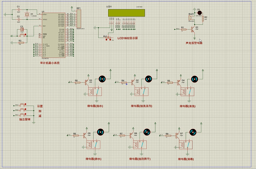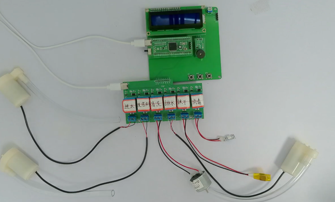 1、清洗过程:加水(5s)——加洗涤剂(3s)——清洗(10s)——排水(5s)——加水(5s)——清洗(10s)——排水(5s)——加热烘干(5s)——消毒(5s)——结束(声光报警3声)