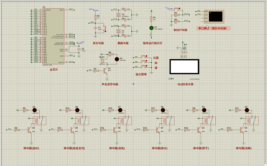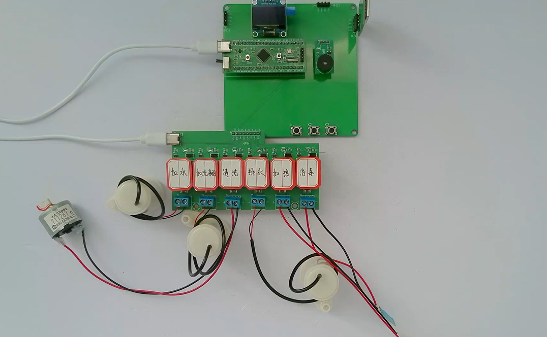 1、清洗过程:加水(5s)——加洗涤剂(3s)——清洗(10s)——排水(5s)——加水(5s)——清洗(10s)——排水(5s)——加热烘干(5s)——消毒(5s)——结束(声光报警3声)