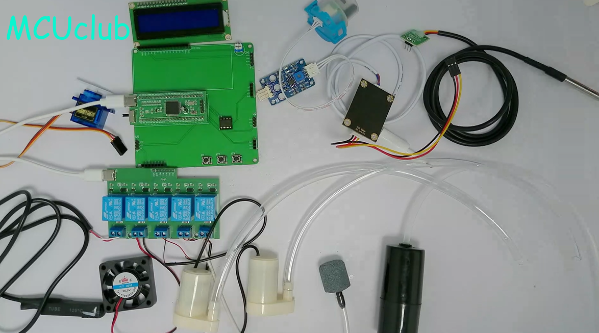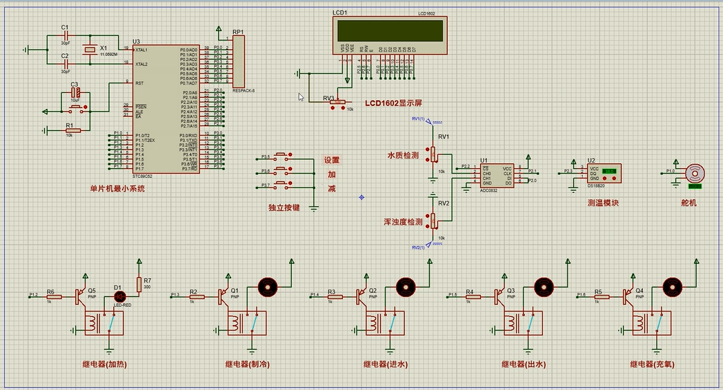 1、通过防水式DS18B20检测水温,水温大于设置的最大值,进行降温(风扇);水温小于设置的最小值,进行加热(加热棒)