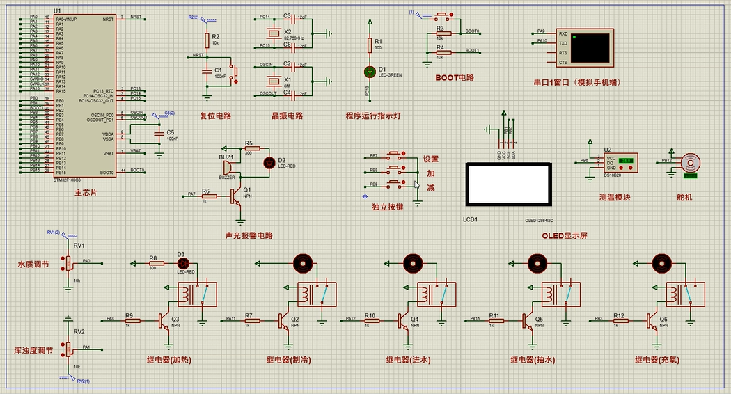 1、通过防水式DS18B20检测水温,水温大于设置的最大值,进行降温(风扇);水温小于设置的最小值,进行加热(加热棒)