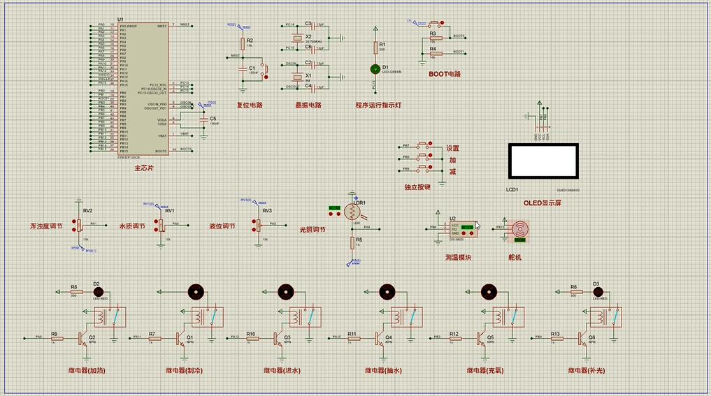 1、通过防水式DS18B20检测水温,水温大于设置的最大值,进行降温(风扇);水温小于设置的最小值,进行加热(加热棒)